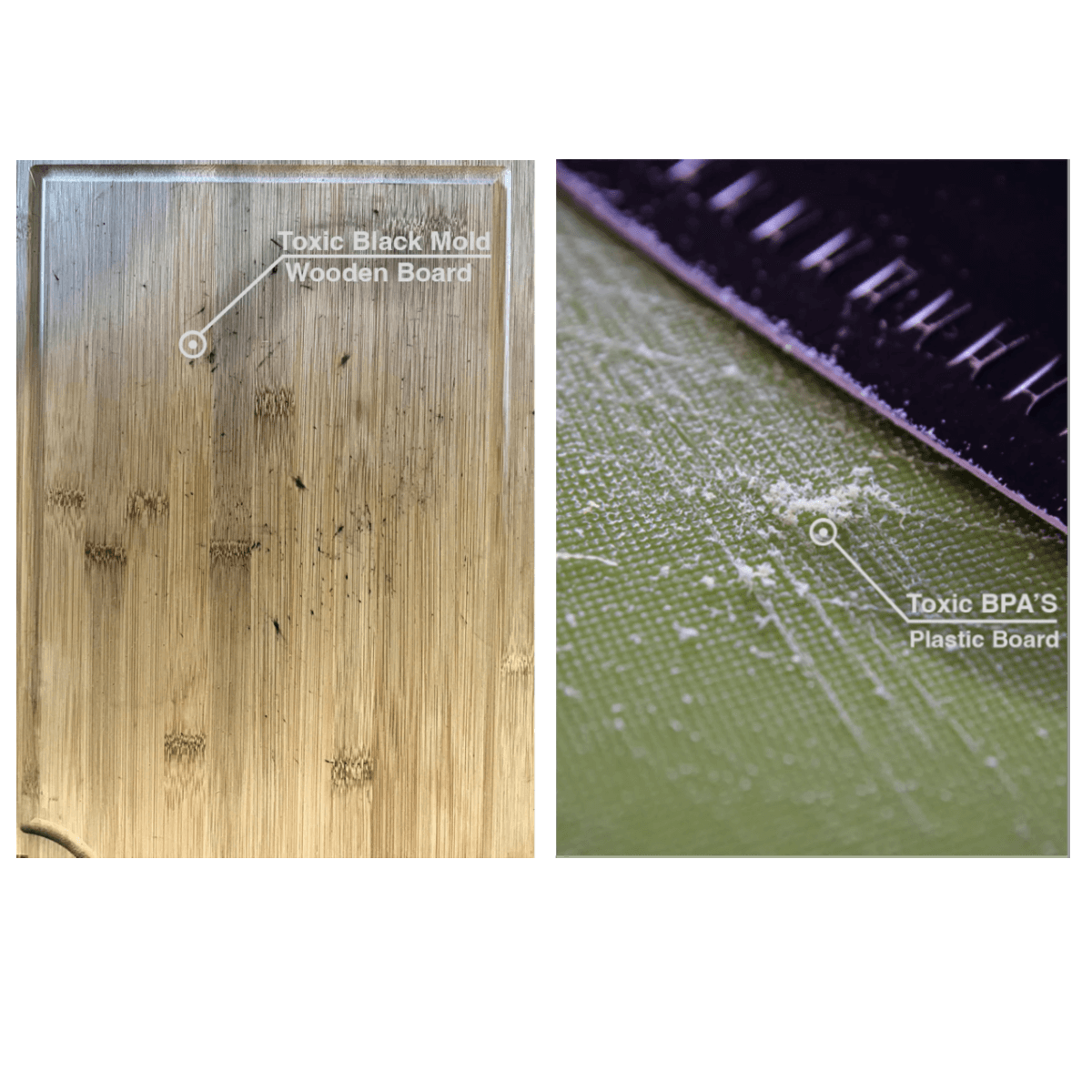 Contains BPA’S or other harmful chemicals that can leach into food during cutting, posing a risk to health. Plastics are also prone to scratches where bacteria